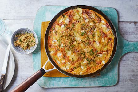 Meanwhile, add the breadcrumbs and butter to another frying pan. Cook over a medium to high heat, stirring all the time until the breadcrumbs are golden brown. Remove from the heat and stir through the parsley. Scatter the mix over the top of the frittata for a little extra crunch.