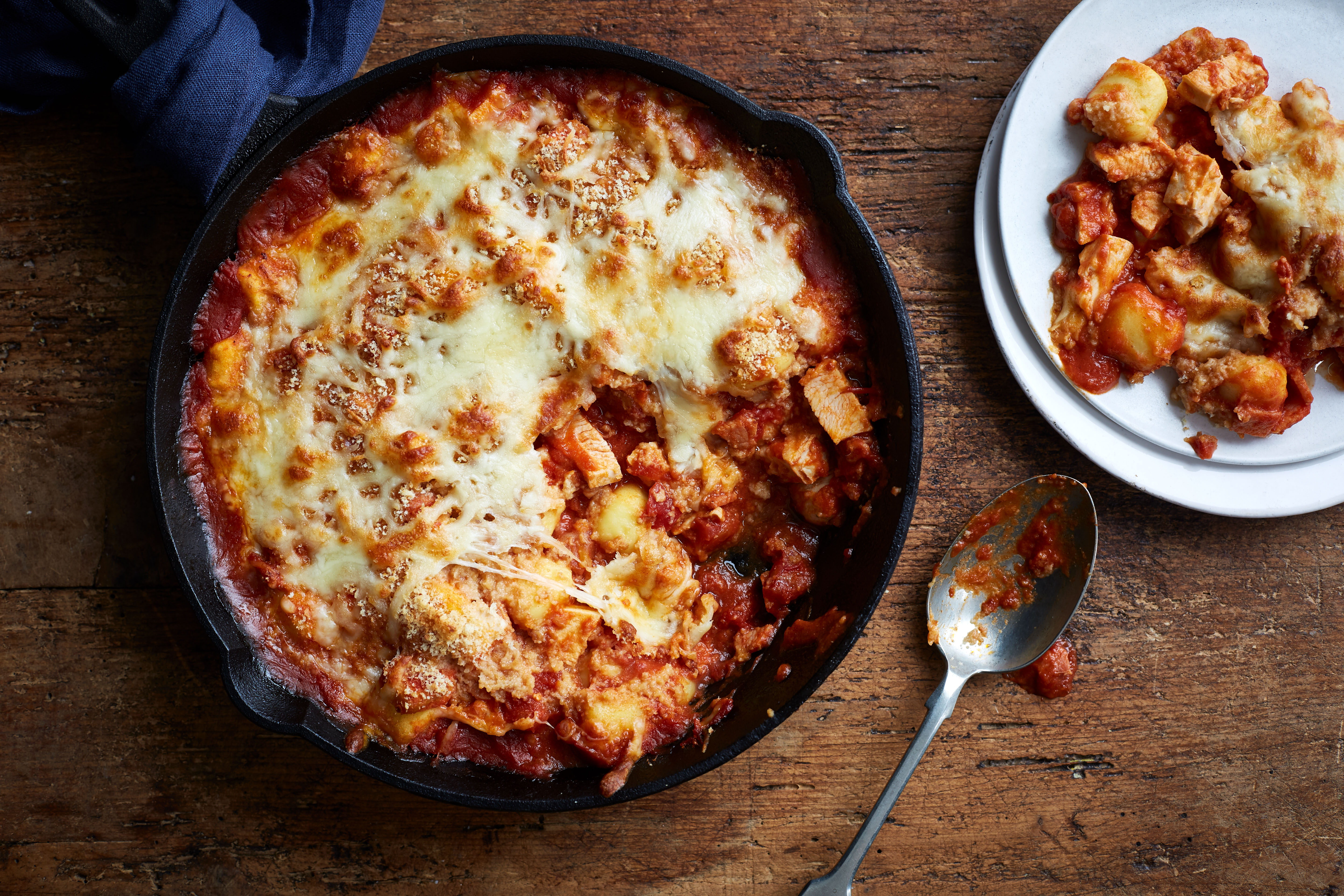 Add the gnocchi and chicken, bring back to a simmer then carefully pour into an ovenproof dish. Cover with the breadcrumbs and cheese then bake for 10 minutes until the cheese is golden and bubbling. Leave to cool for a couple of minutes then serve each portion with a simple green salad.