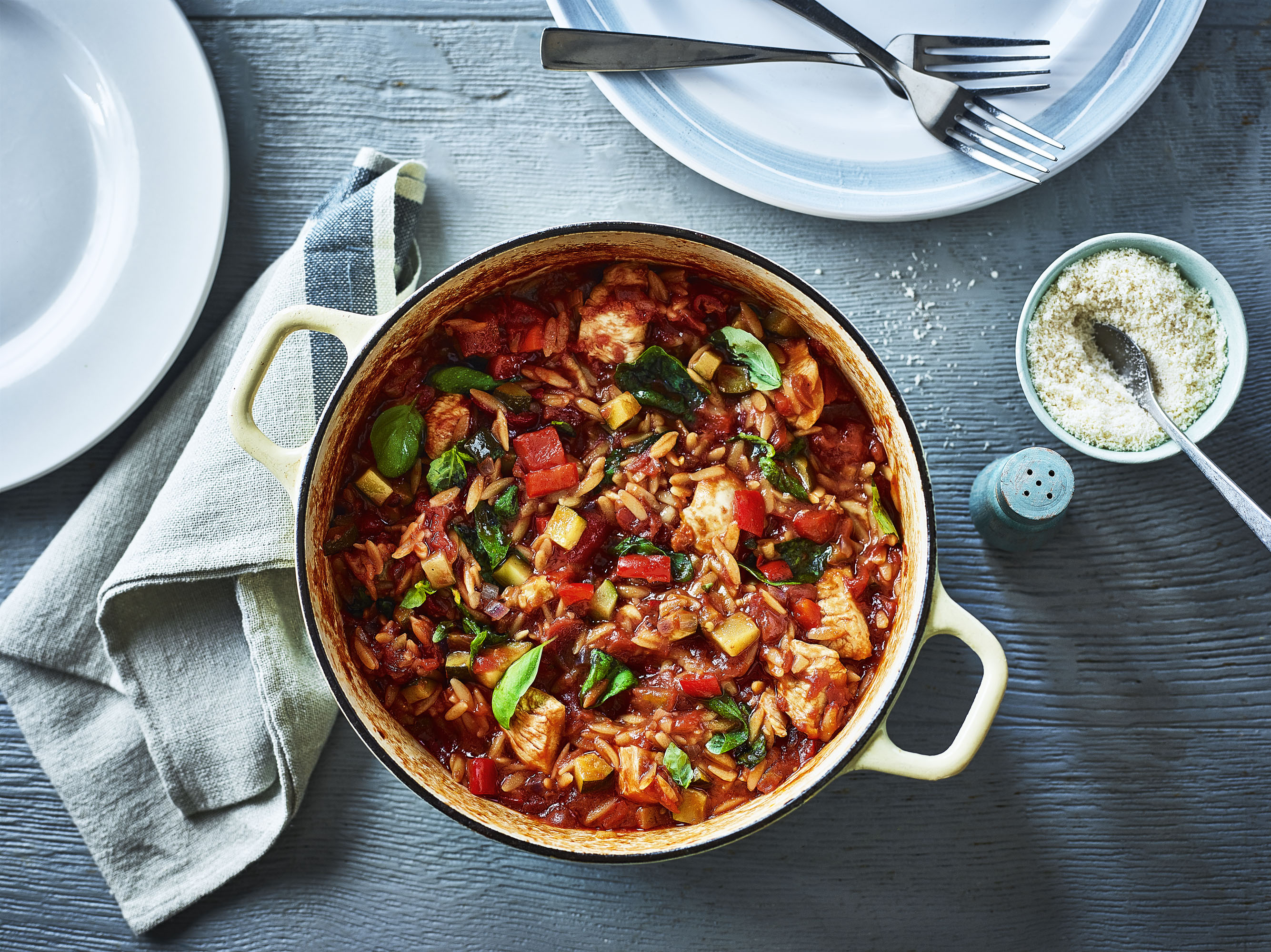 Mix the chicken pieces together with the dried oregano and a little salt and pepper. Heat the oil in a non-stick frying pan and cook the chicken pieces for a few minutes until cooked through and starting to turn golden. Remove from the pan and set to one side.