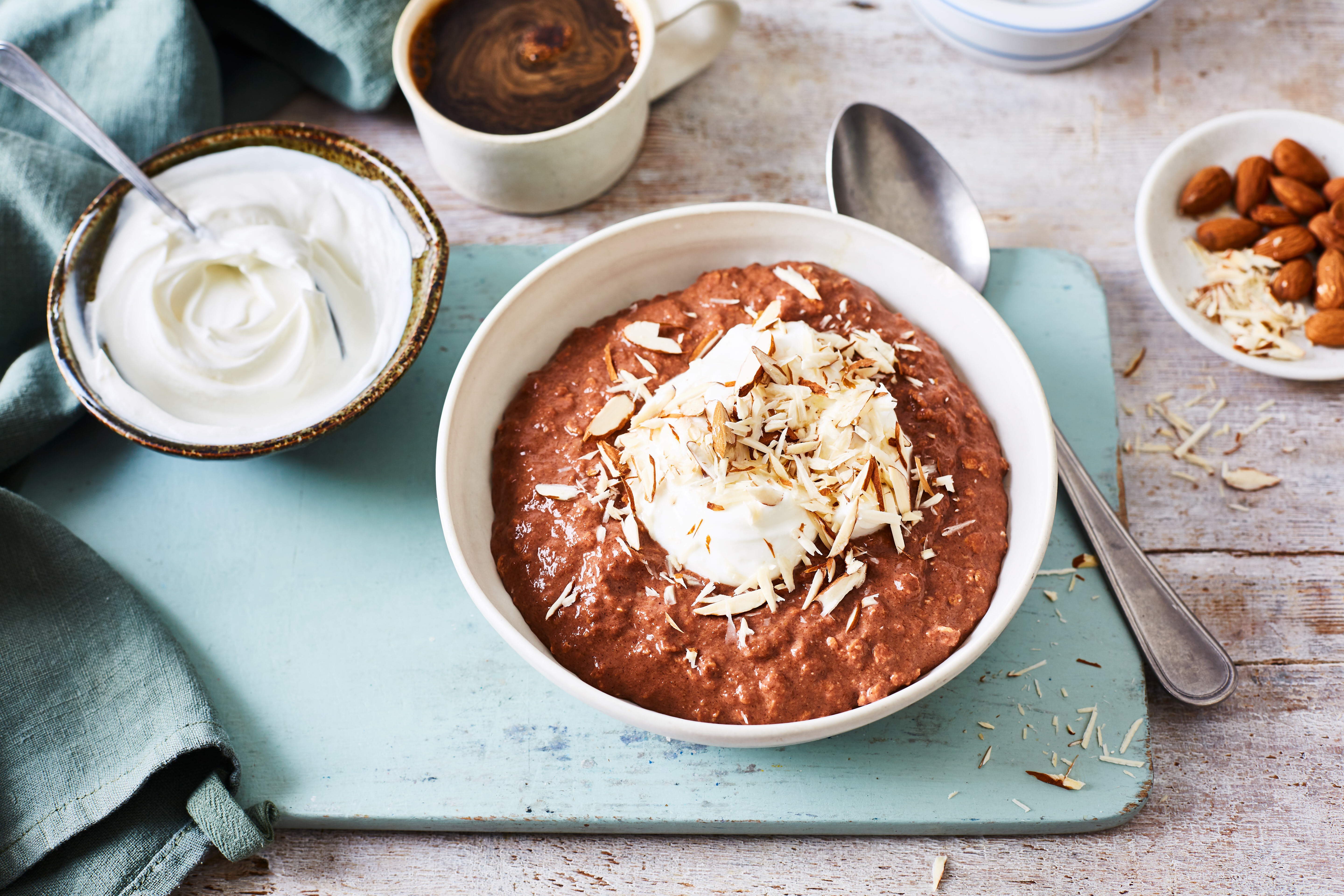 The next morning stir in the yoghurt and serve topped with the sliced almonds.