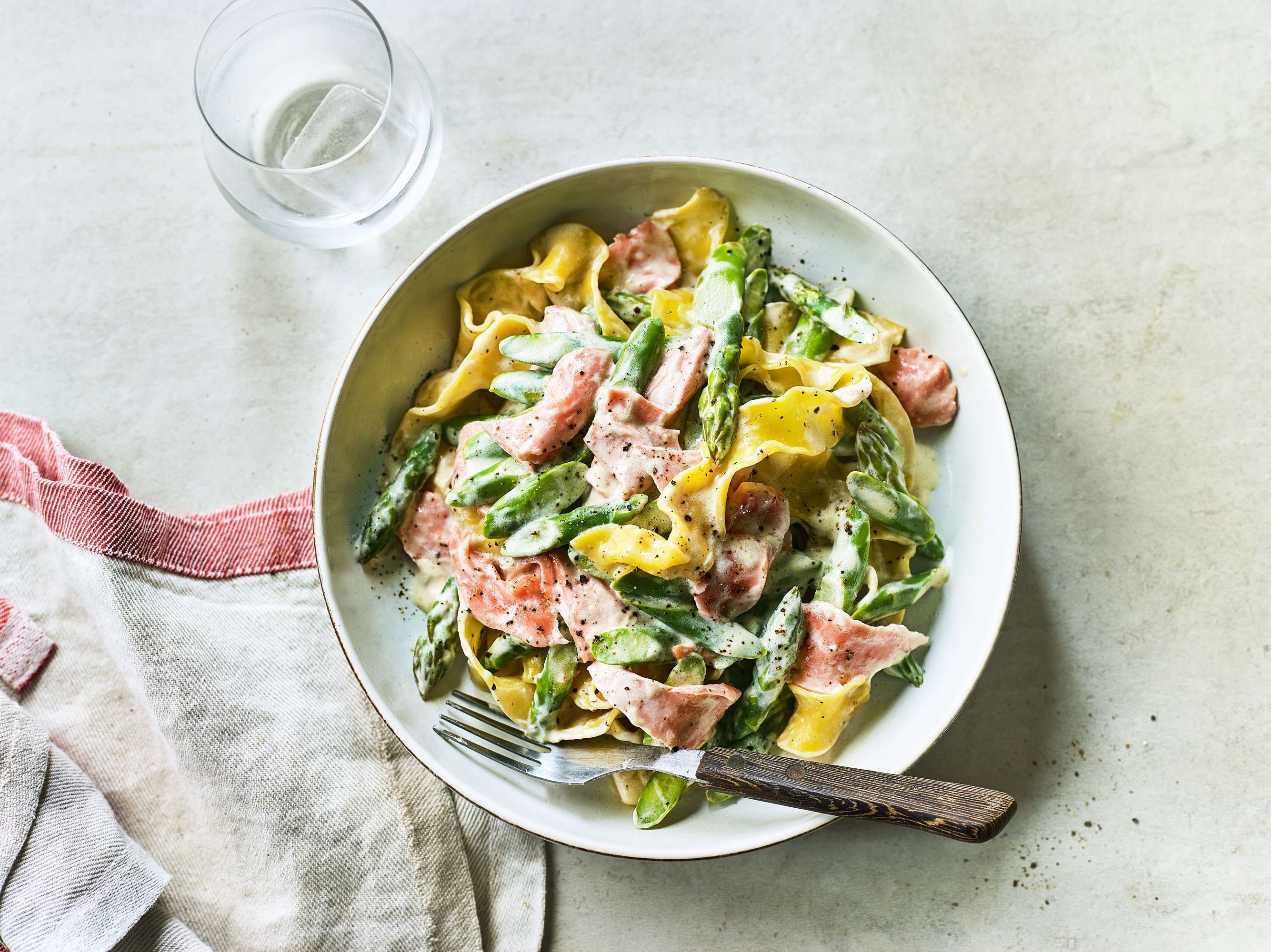Meanwhile bring a large pan of salted water to the boil. Add the pasta and cook according to the packet instructions, adding the asparagus for the final minute of cooking. Drain the pasta and asparagus, reserving a little of the cooking water.