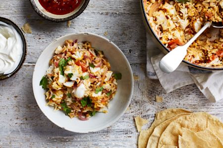 Preheat the oven to 200°C. Put the fish in a bowl with the spices and the yoghurt, toss to coat and set aside. Bring a pan of salted water to the boil, add the rice, bring to the boil and cook for 4-5 minutes then drain; at this stage you're just par-cooking the rice.