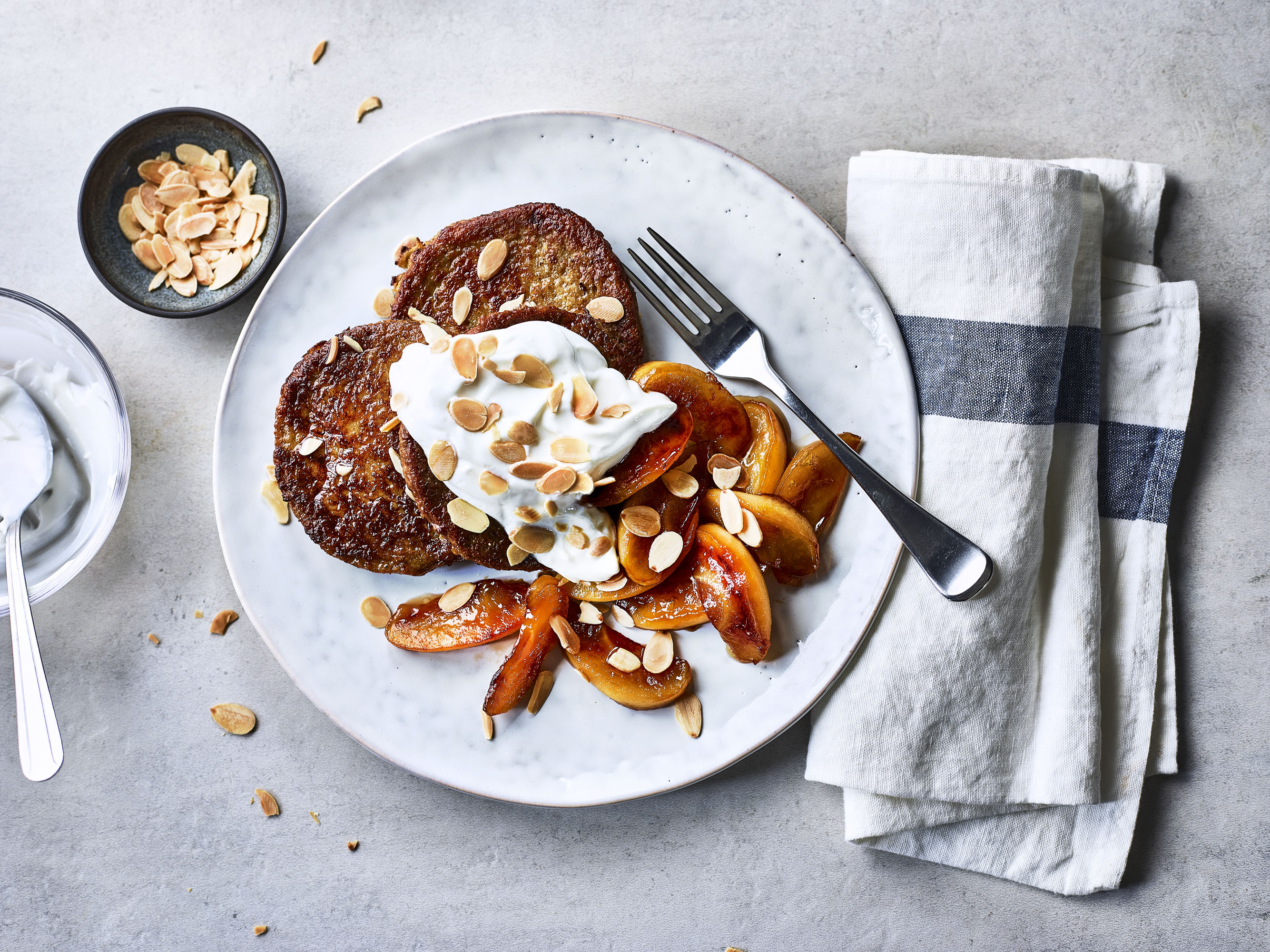 Melt the butter in a non-stick frying pan, add the soaked muffin halves and fry for 2 minutes on each side or until golden. Transfer to a plate, spoon over the apples then top with the yoghurt and almonds to serve.