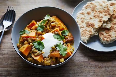 Serve the curry with the quark, coriander leaves and flatbread.