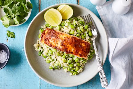 Meanwhile heat the coconut oil in a large frying pan and fry the cauliflower rice for a few minutes before adding in the coconut milk and edamame beans. Let everything come to a very gentle simmer then serve the salmon on top of the coconut rice. Finish with some lime juice and chopped coriander.