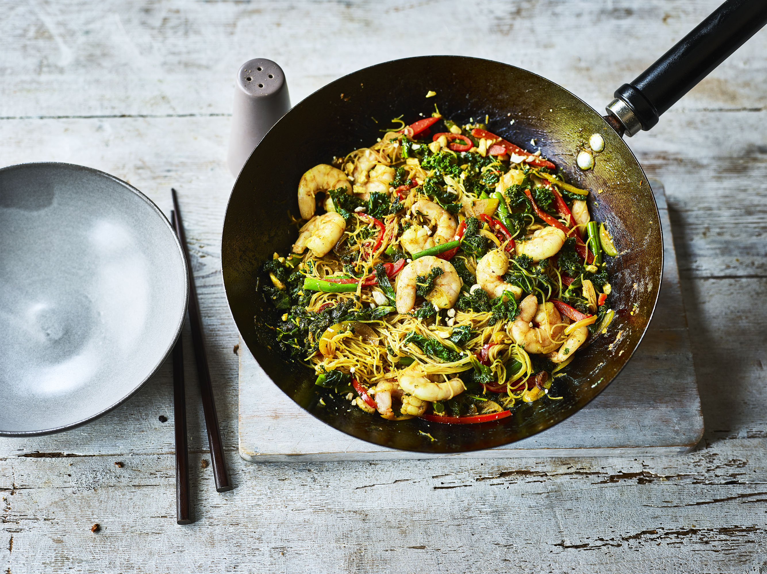 Heat the oil in a wok or large frying pan until smoking then add the onion, garlic, ginger and chilli. Fry for 2 minutes then add the curry powder and fry for a further minute. Add a splash of water then add the vegetables. Stir fry for a few minutes then add the prawns, noodles and nuts and toss everything together. Remove from the heat, season with the soy sauce and serve.