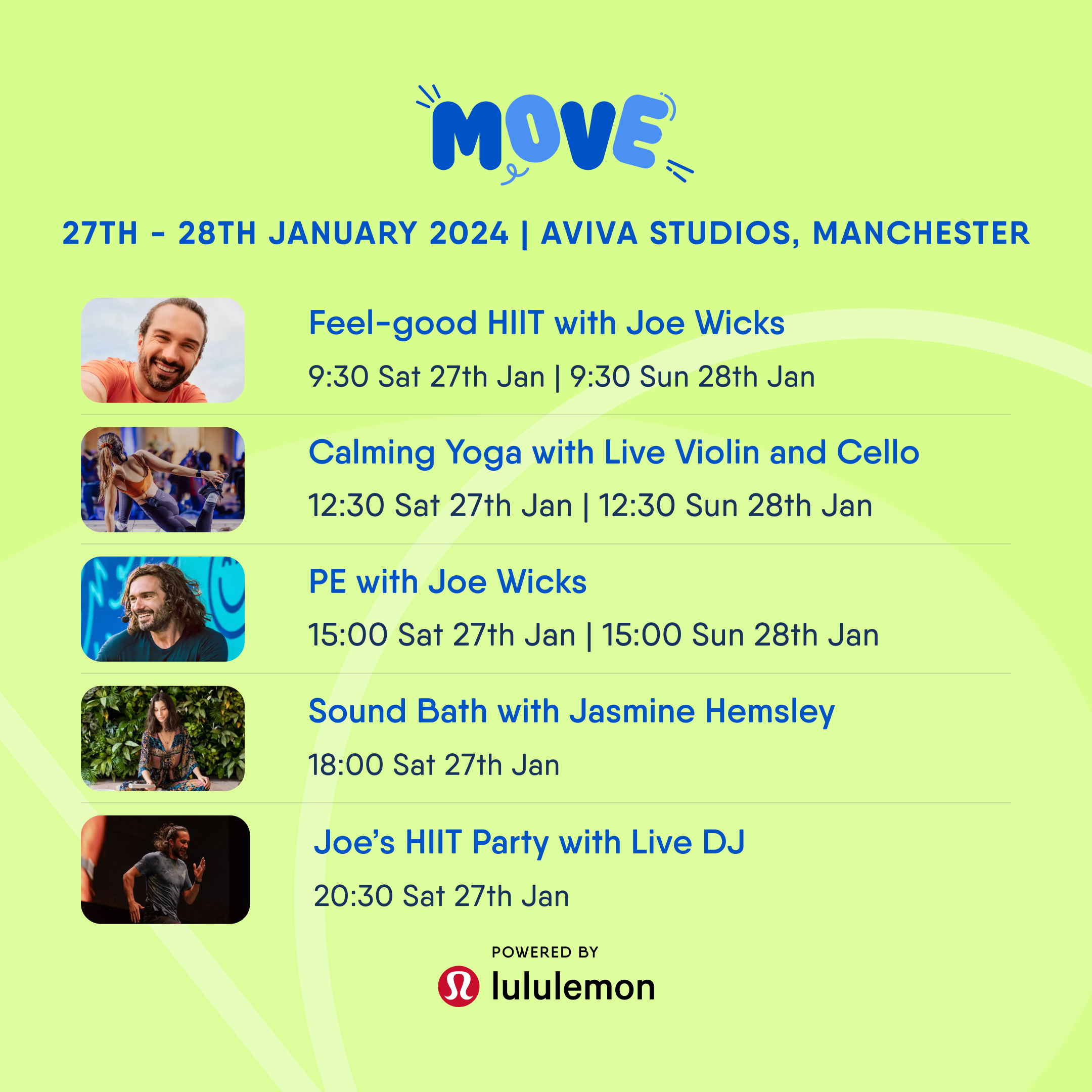 Joe is taking over Aviva Studios in Manchester for the weekend with a series of fitness and self-care activities for all ages and abilities. Whether you're a seasoned fitness lover or a total beginner, MOVE has something for everyone.